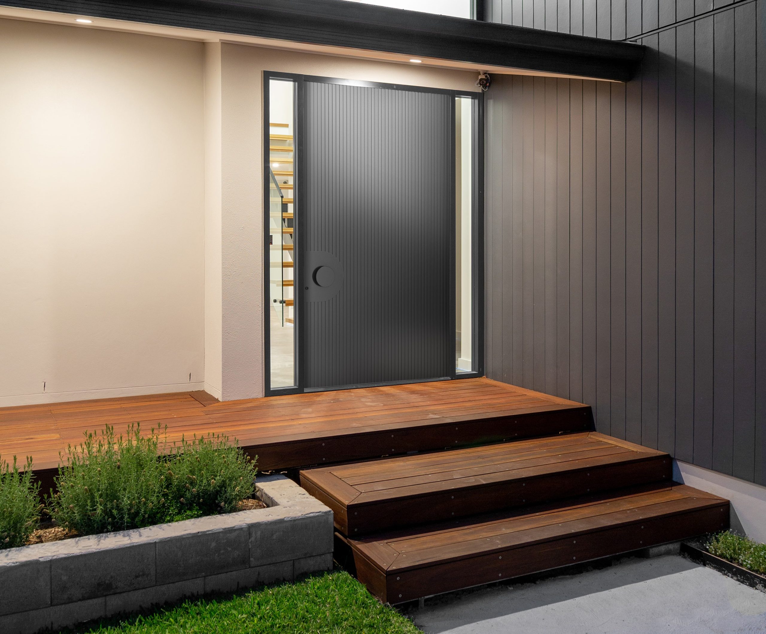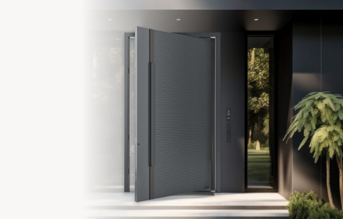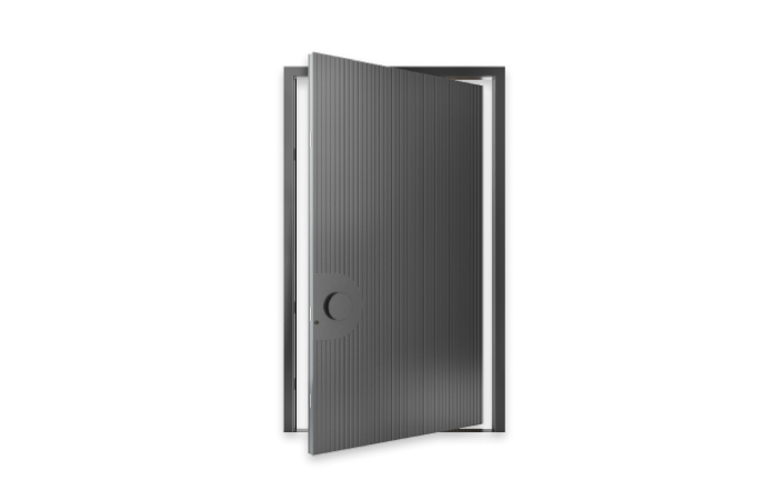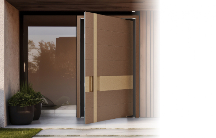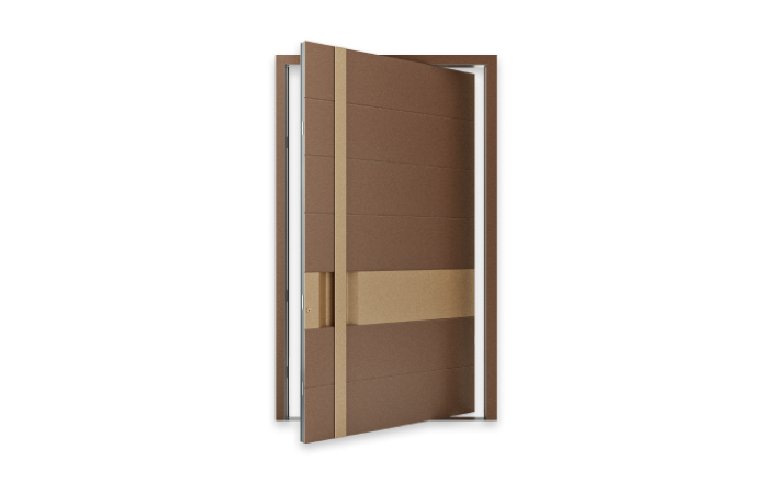 Frezowania na powierzchni wypełnienia drzwiowego są możliwe dzięki technologi tworzenia poziomych regularnych przetłoczeń na panelu aluminiowym.