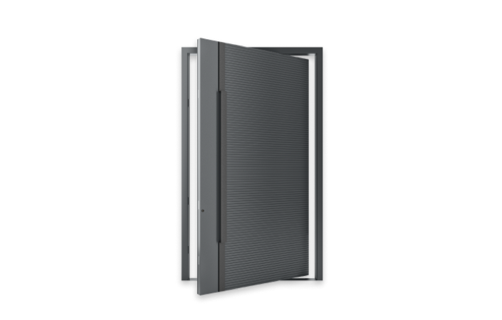Pionowe linie o regularnym układzie na wypełnieniu drzwiowym modelu PIVOT 08 tworzą kompozycję, która emanuje harmonią i głębią.